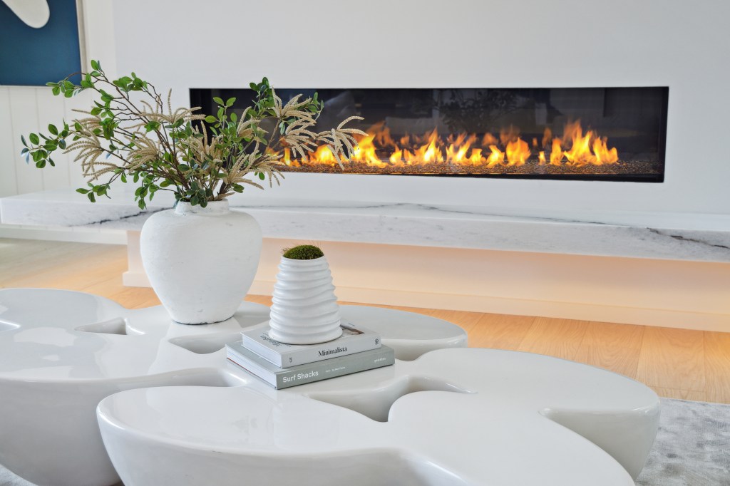 The heart of the home lies in its state-of-the-art kitchen, where culinary excellence meets contemporary design. Equipped with the latest appliances and sleek, custom cabinetry by one of our favorite cabinet makers, Andersen Quality Woodworks, the kitchen is a chef’s dream, offering ample space for culinary experimentation and casual dining alike. A peninsula island provides a focal point for socializing and entertaining, with a hidden bar for cocktails and a pull out hidden TV, while views of the lagoon provide a constant source of inspiration.