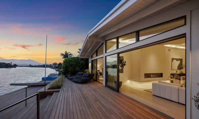 A terrace with outdoor dining area, lounge seating and dock access to the sparkling lagoon waters offers the perfect setting for outdoor entertaining and relaxation, while lush greenery and flowering plants provide a sense of privacy and seclusion.